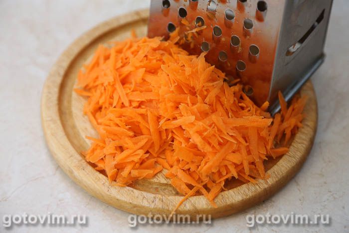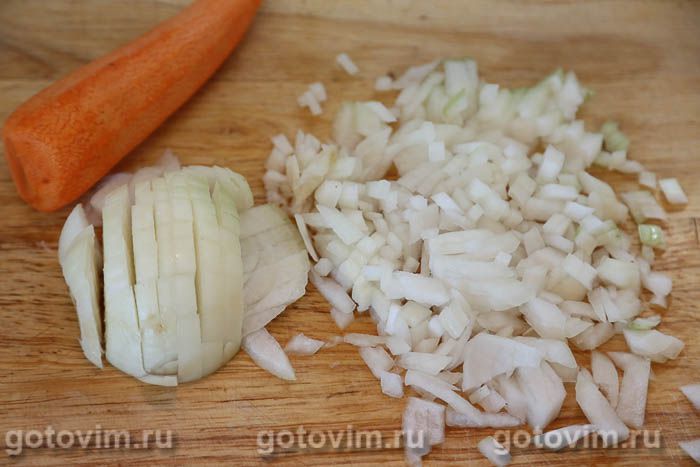 Приготовить овощи для пассеровки. Лук и морковь очистить. Морковь натереть на крупной терке или нарезать соломкой.