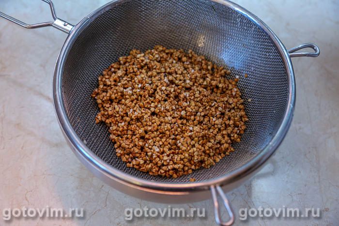 Гречку хорошо промыть в холодной воде и откинуть на сито.