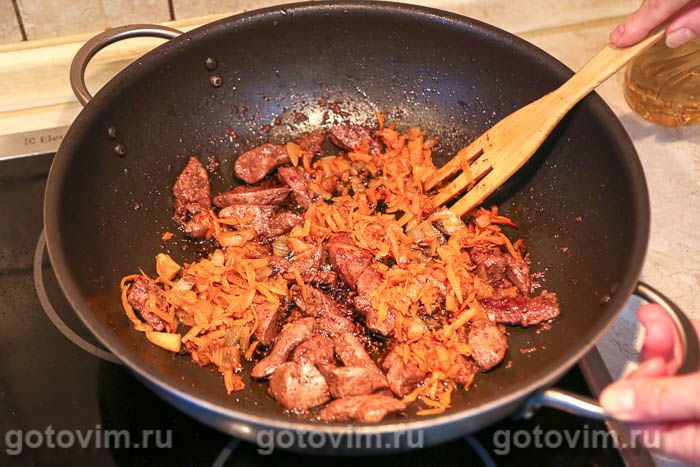 Переложить в сковороду с обжаренной печенкой овощную пассеровку. Готовить, помешивая, 1-2 минуты.