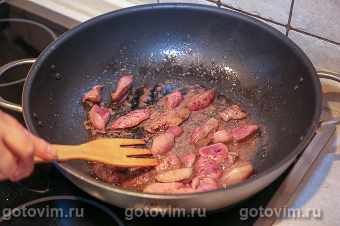 В другой сковороде или кастрюле с толстым дном разогреть немного масла и частям слегка обжаривать утиную печень. Жарить печень до готовности не надо, достаточно, чтобы она лишь слегка схватилась, покрылась корочкой. Внутри печень должна оставалась сырой! Посолить по вкусу, приправить молотым черным перцем.