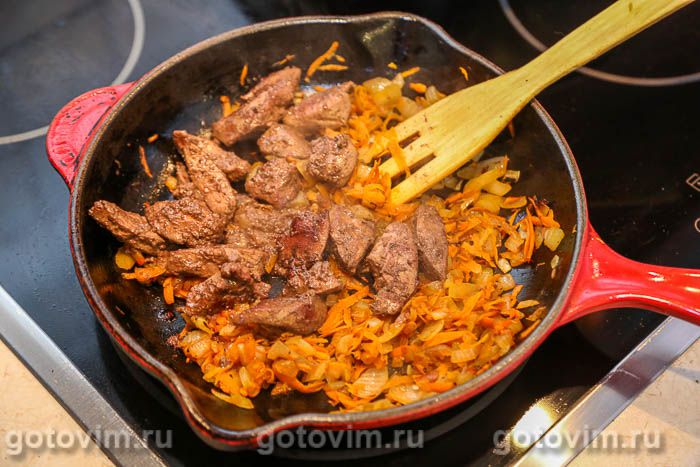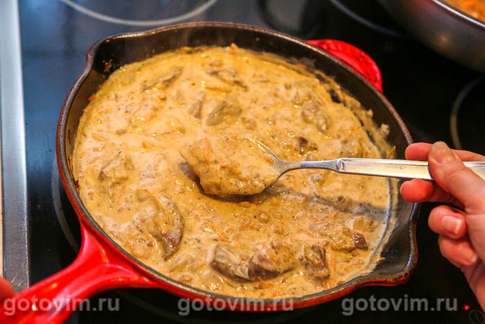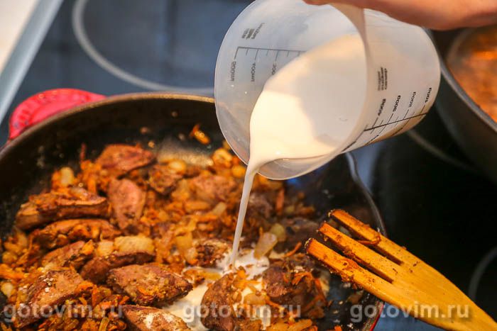 Тонкой струйкой влить молоко, размешивая печень с овощами.
