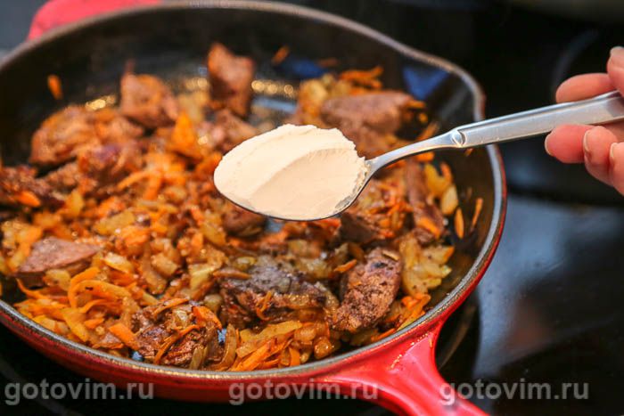 Посыпать мукой, аккуратно перемешать, чтобы она равномерно распределилась, покрывая кусочки печени и овощи.