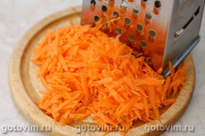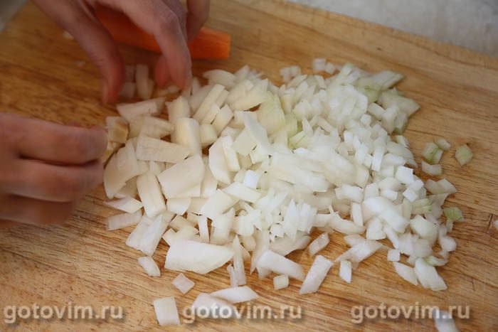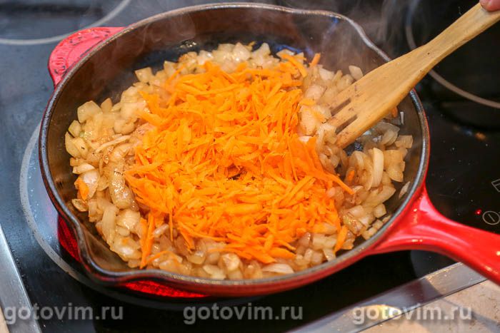 В глубокой сковороде растопить сливочное масло вместе с растительным (можно использовать только растительное масло). Добавить лук и пассеровать до прозрачности. Следом переложить измельченную морковь, размешать, посолить по вкусу и обжаривать, помешивая, все вместе до мягкости морковь. Овощную пассеровку переложить на тарелку.