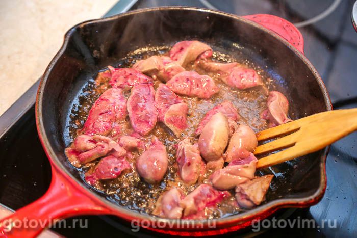 Добавить в сковороду еще немного масла и частям обжаривать утиную печень. Надо только слегка обжарить печенку, чтобы внутри она оставалась сырой. Посолить по вкусу, приправить молотым черным перцем.